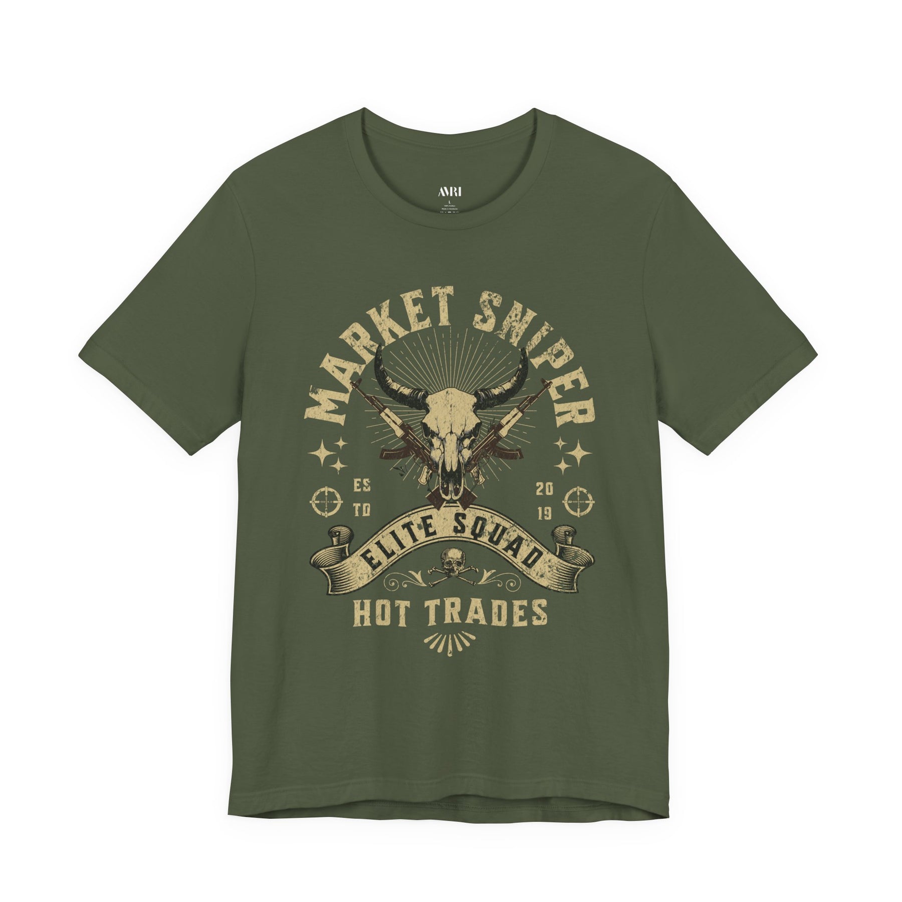 A battlefield emblem for traders who operate with precision, patience, and lethal execution.  The crossed sniper rifles and bull skull symbolize dominance and discipline — a brotherhood forged in volatility and forged for profit.  Distressed in vintage off-white ink, this piece captures the grit of a soldier and the focus of a marksman.