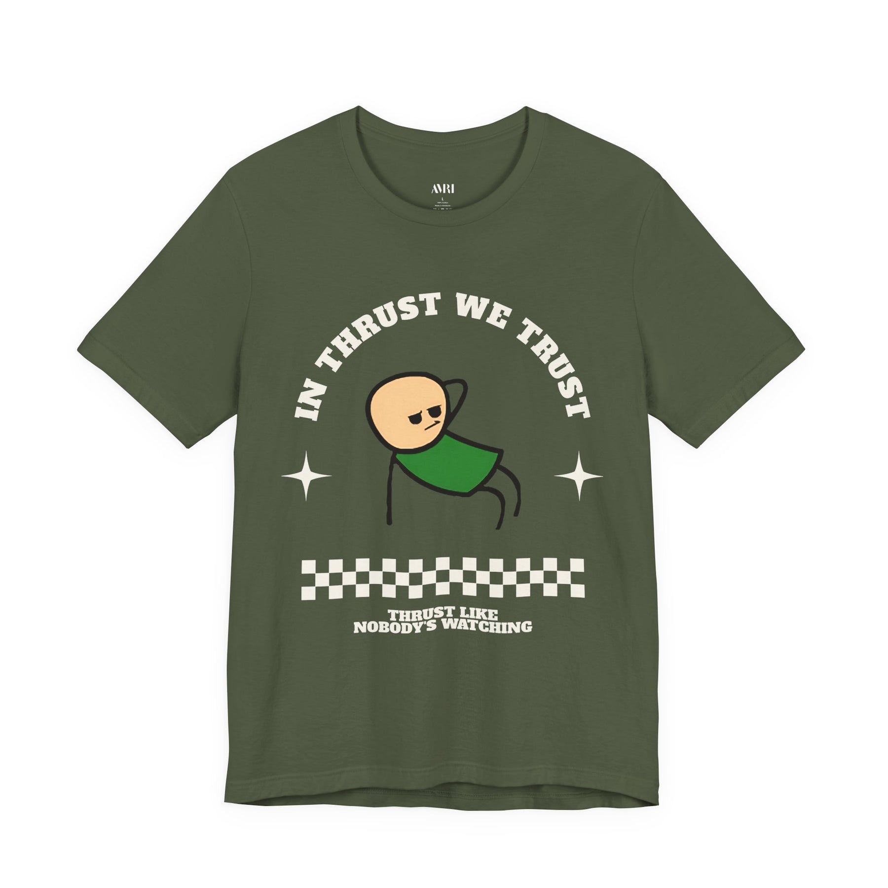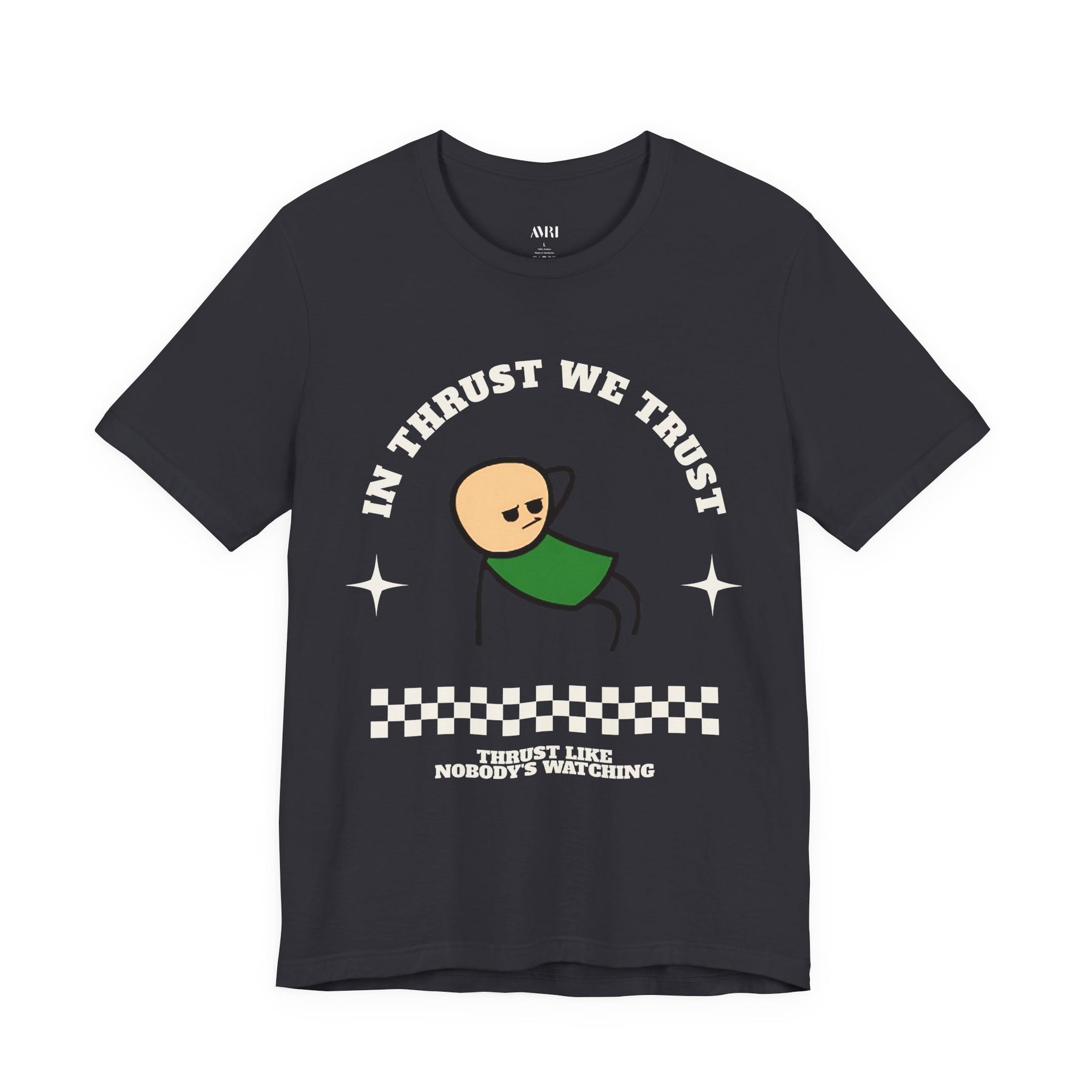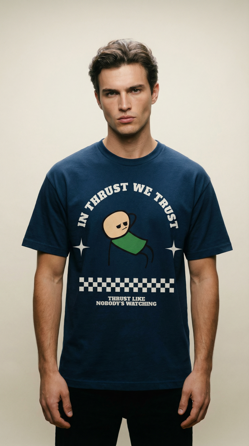 Get ready to shake up the silence with Thrust Issues — the tee that turns awkward energy into absolute confidence. Featuring a bold cartoon figure mid-thrust and unapologetic text that reads “In Thrust We Trust” and “Thrust Like Nobody’s Watching,” this shirt is equal parts chaotic and iconic. Finished with racing checks and retro sparkles, it’s made for those who don’t take life too seriously — but take their thrusting very seriously. Perfect for parties, festivals, or just reminding the world that movement is a mindset.
