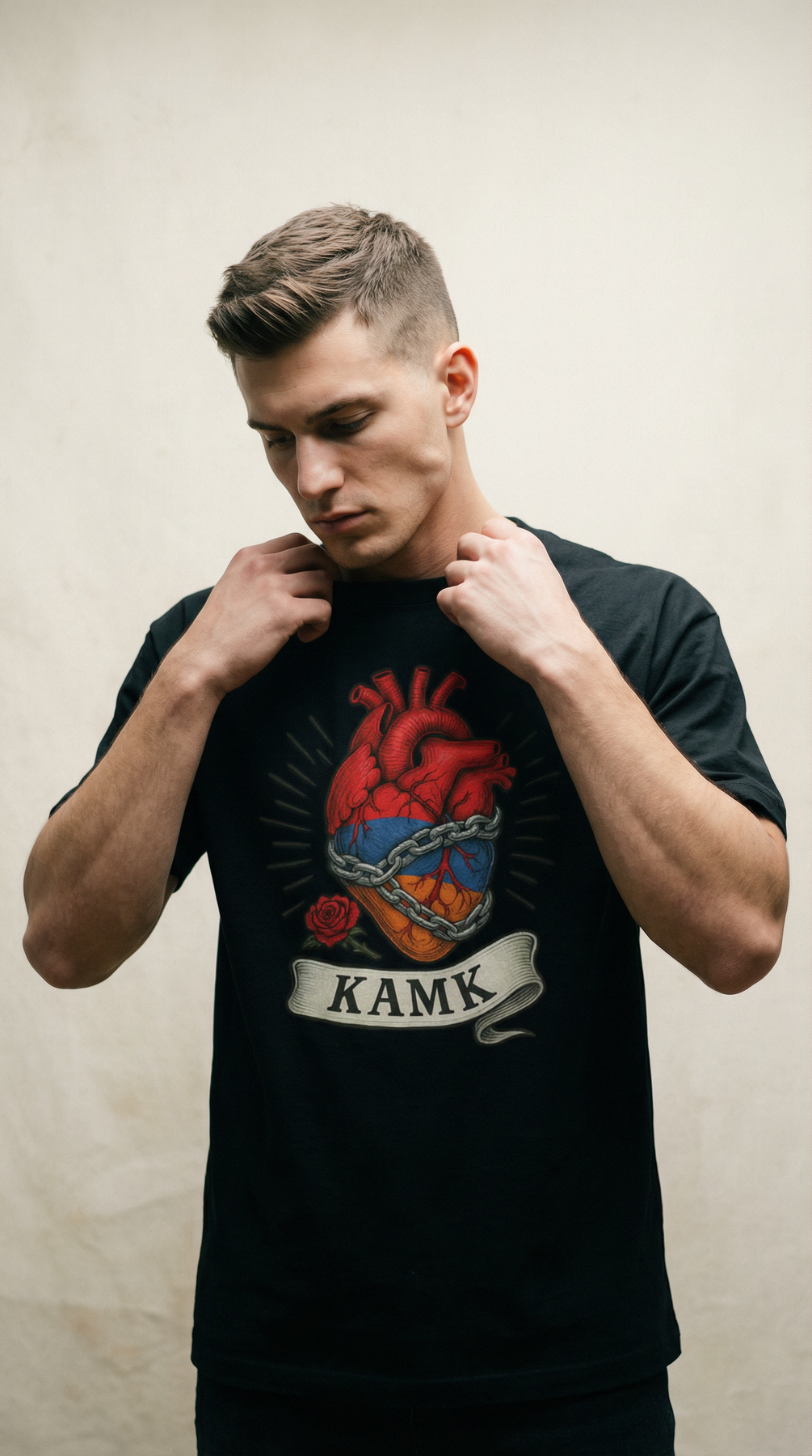 Iron Pulse is a tribute to unbreakable spirit, born from heritage, heartbreak, and hope. The design features an anatomically accurate heart wrapped in iron chains, painted in the vivid tricolor of the Armenian flag—red for sacrifice, blue for peace, and orange for resilience. A blood-red rose blossoms at its base, symbolizing love that endures through adversity. Below, the word KAMK—“Willpower” in Armenian—flows boldly through a weathered ribbon, rendered in gothic script. This piece embodies the struggle and strength of a people whose pulse refuses to fade. Wear it as armor. Live it as legacy.Product features